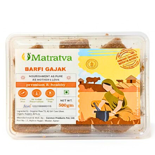 Mark of Quality This Gajak offers the rich, tender texture of a Barfi combined with the wholesome crunch of Til (sesame) and Nuts. This sweet is prepared with nourishment that is pure as Mother's Love.
