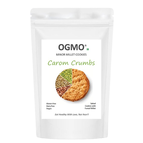 Mark of Quality These "Carom Crumbs" are wholesome, salted cookies made with unpolished Foxtail Millet and rich Peanuts. They offer a savory twist with the distinct aroma of Carom (Ajwain) and the crunch of Pumpkin Seeds, making them a perfect companion for your tea or coffee.