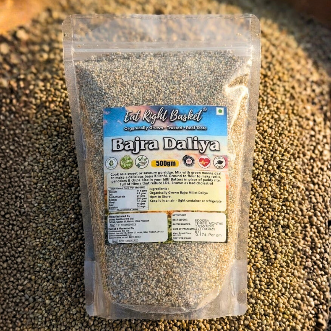 Mark of Purity Sourced from trusted farmers who strictly follow traditional organic farming practices, our Bajra Daliya is a symbol of purity. It is grown without synthetic fertilizers, urea, pesticides, or growth hormones, ensuring that you bring home only the safest and most natural grain for your family.