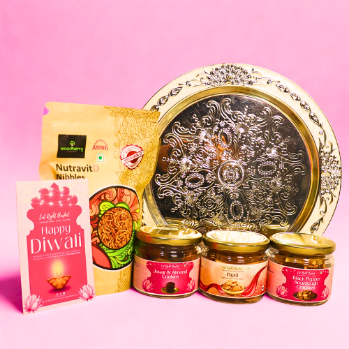 The Packaging: All these delicious treats are presented on a beautiful Engraved Round Platter of white metal, a sophisticated and reusable gift in itself.