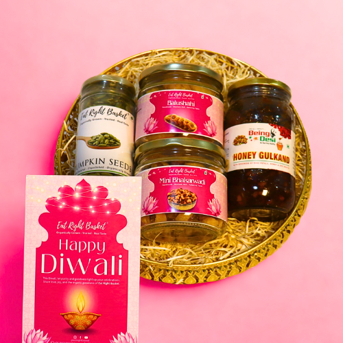 This hamper is a beautiful blend of traditional Indian flavors and nutritious taste, crafted with pure and natural ingredients. It’s a delightful gift that offers something for everyone, from sweet and sticky Gulkand Honey and classic Balushahi to savory Bhakarwadi and healthy Pumpkin Seeds. This thoughtful gift is perfect for sharing with family, friends, and colleagues this festive season.