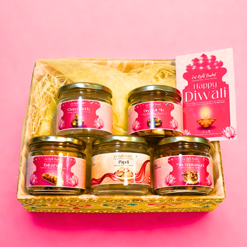 Delight the senses with a mix of traditional sweets and savory treats, all made with pure and natural ingredients. This hamper is a journey of flavors, featuring Bhakarwadi, Chana Atta Laddu, Balushahi, Dry Fruit Mix and Papdi. It is a nutritious, tasty and healthy way to share joy, making it a thoughtful gift for family, friends, and colleagues