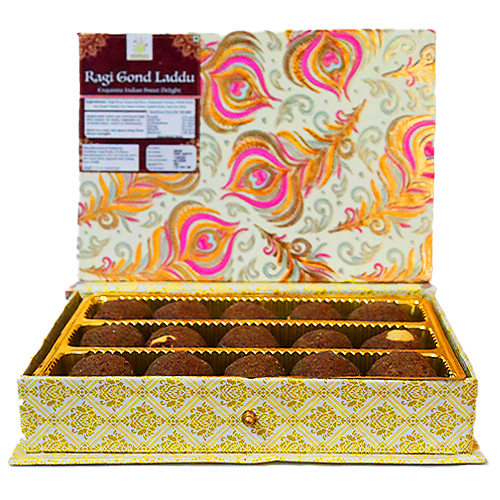 Ingredients: Ragi Flour, Chana Dal Flour, Desiccated Coconut, Edible Gond, Dry Ginger Powder, Dry Dates Powder, Cashew Nuts, Desi Cow Ghee